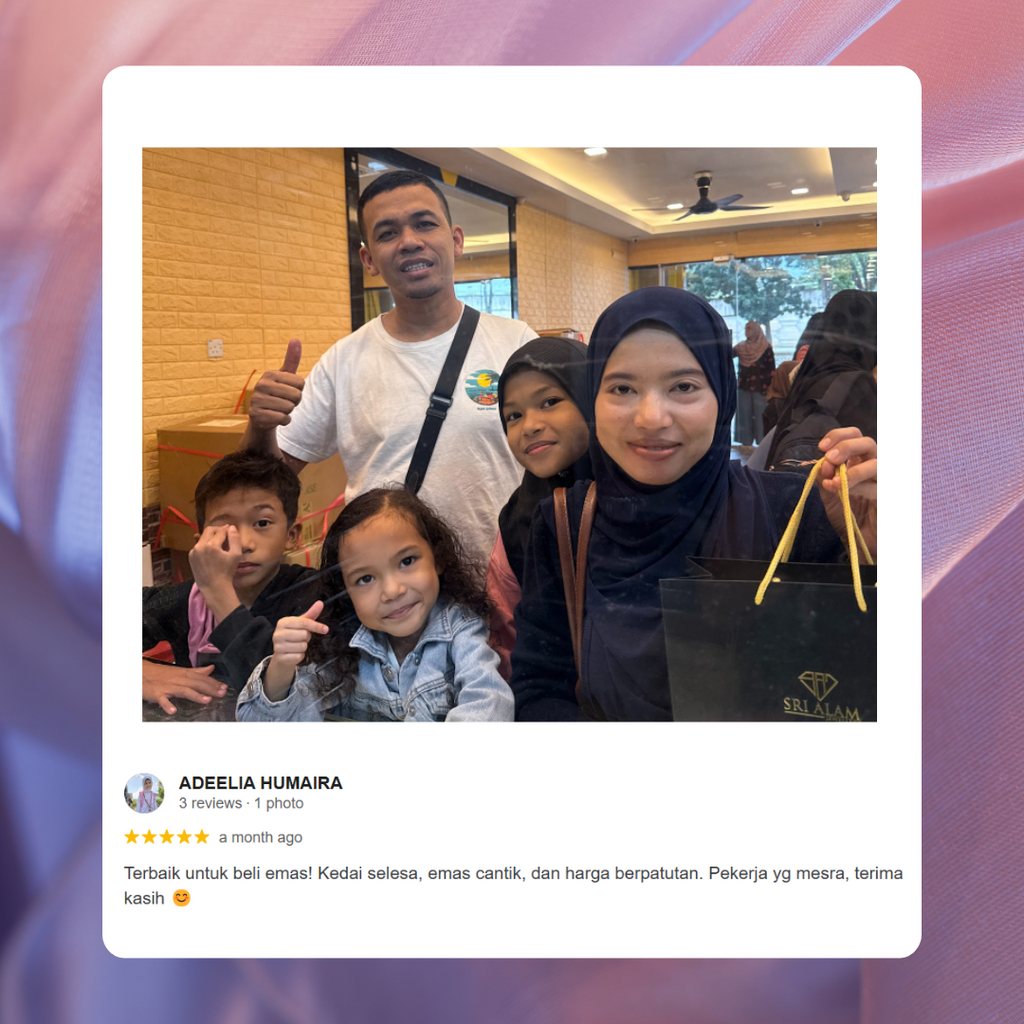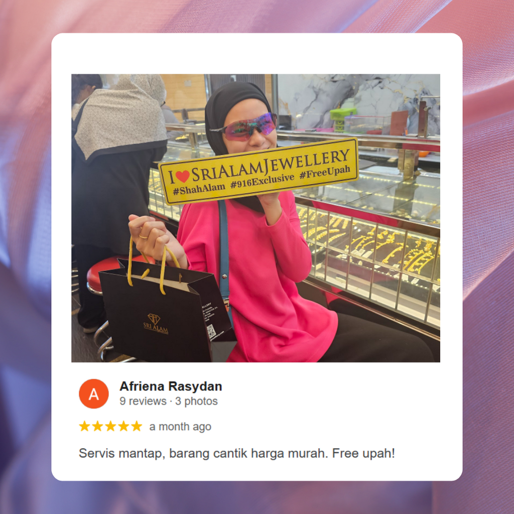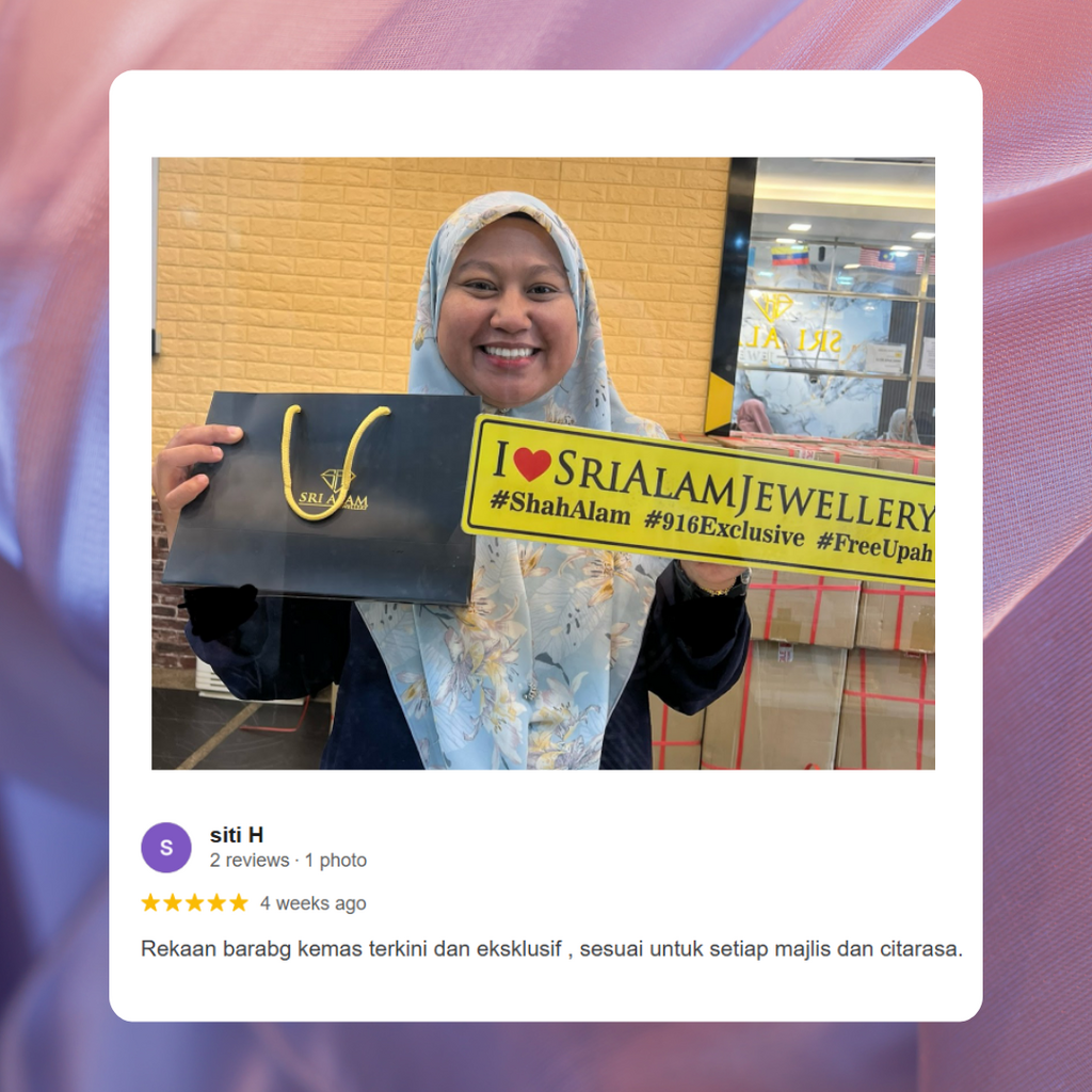 Kami di Sri Alam Jewellery sentiasa berusaha untuk memberikan pengalaman yang terbaik kepada setiap pelanggan kami. Jangan hanya percaya pada kata-kata kami—dengarkan apa yang pelanggan kami katakan!
