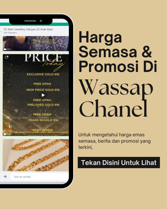 Selain daripada harga emas, kami juga sering mengadakan pelbagai promosi yang menarik. Promosi ini termasuk diskaun istimewa, pembelian tanpa caj tambahan, dan hadiah eksklusif untuk setiap pembelian tertentu. Semua maklumat ini akan kami kongsikan terus di WhatsApp Channel supaya anda tidak akan terlepas peluang menarik.